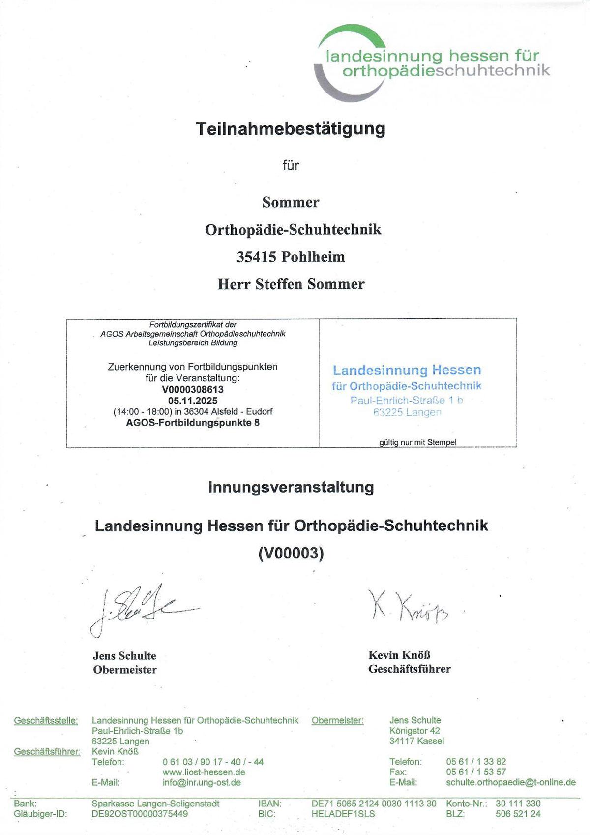 Erfahrungsaustausch mit Kollegen aus Hessen, Nordrhein-Westfalen und Bayern findet stetig statt. Die Mitgliedschaft im Freundeskreis der Münchner Bildungsstätte für Orthopädie-Schuhtechnik und der regelmäßige Besuch deren Fachtagung in München, sowie Weiterbildungsmaßnahmen bei der Landesinnung in Hessen, garantieren den immer aktuellen Stand bei Arbeitstechnik, Materialkenntnis und den Inovationen in unserem Fachbereich.